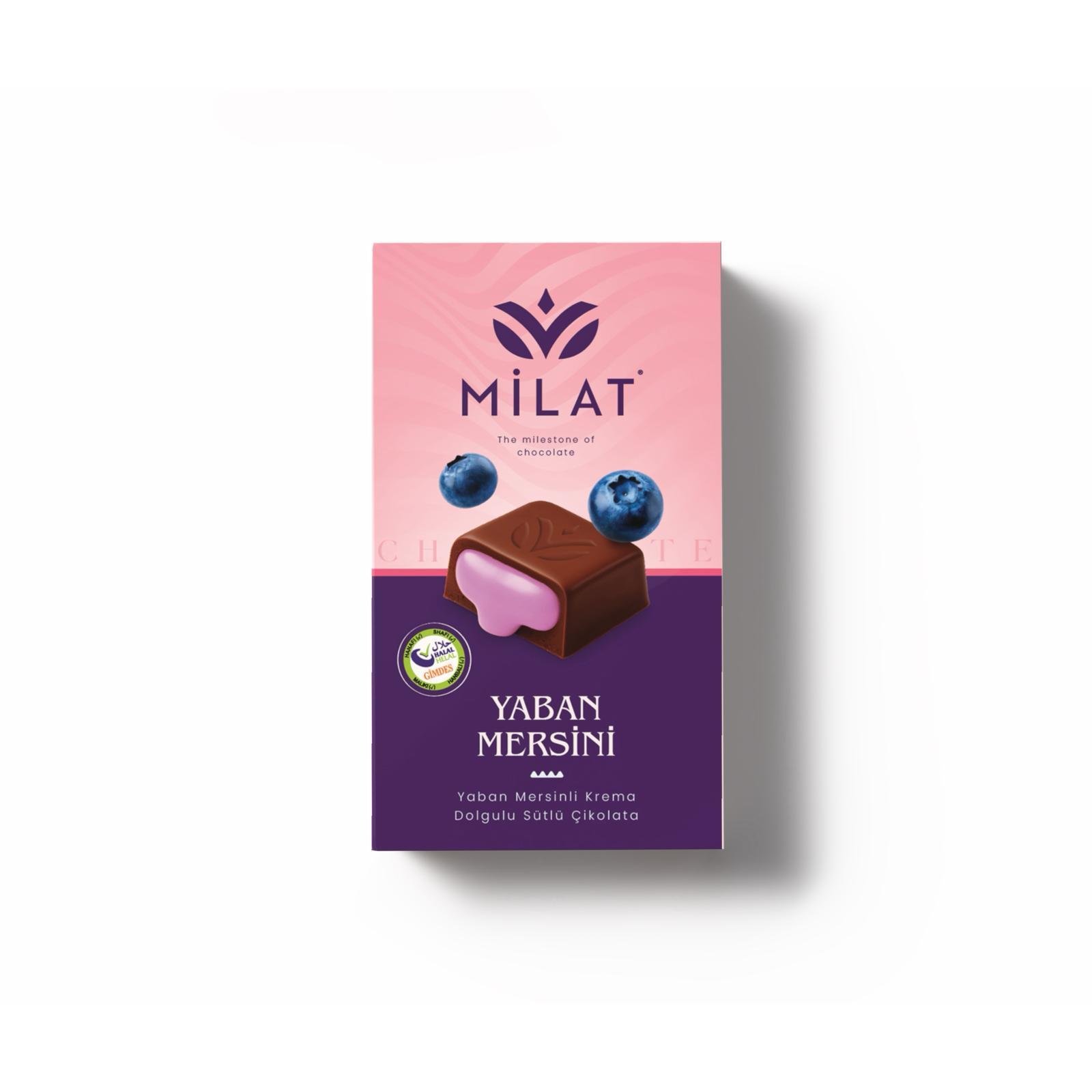 YABAN MERSİNİ DOLGULU SÜTLÜ ÇİKOLATA İçindekiler : Sütlü çikolata (%60) [şeker, kakao yağı, tam yağlı süt tozu, kakao kitlesi, emülgatör (ayçiçek lesitini), aroma verici (vanilya)], Yaban Mersini krema dolgu (%40) [şeker, bitkisel yağ, yağlı toz, süt yağı, peynir altı suyu tozu (süt ürünü), Yaban Mersini tozu, emülgatör (ayçiçeği lesitini, PGPR), limon tuzu, aroma verici]. Sütlü çikolata en az %35 kakao kuru maddesi içerir. Alerjen Uyarısı : Süt ve süt ürünleri içerir. İz miktarı antep fıstığı, badem, fındık parçaları içerebilir. Saklama Koşulları : 18 - 22°C sıcaklık aralığında, kuru (max. %65 RH) ve kokusuz muhafaza ediniz. Buzdolabına koymayınız.